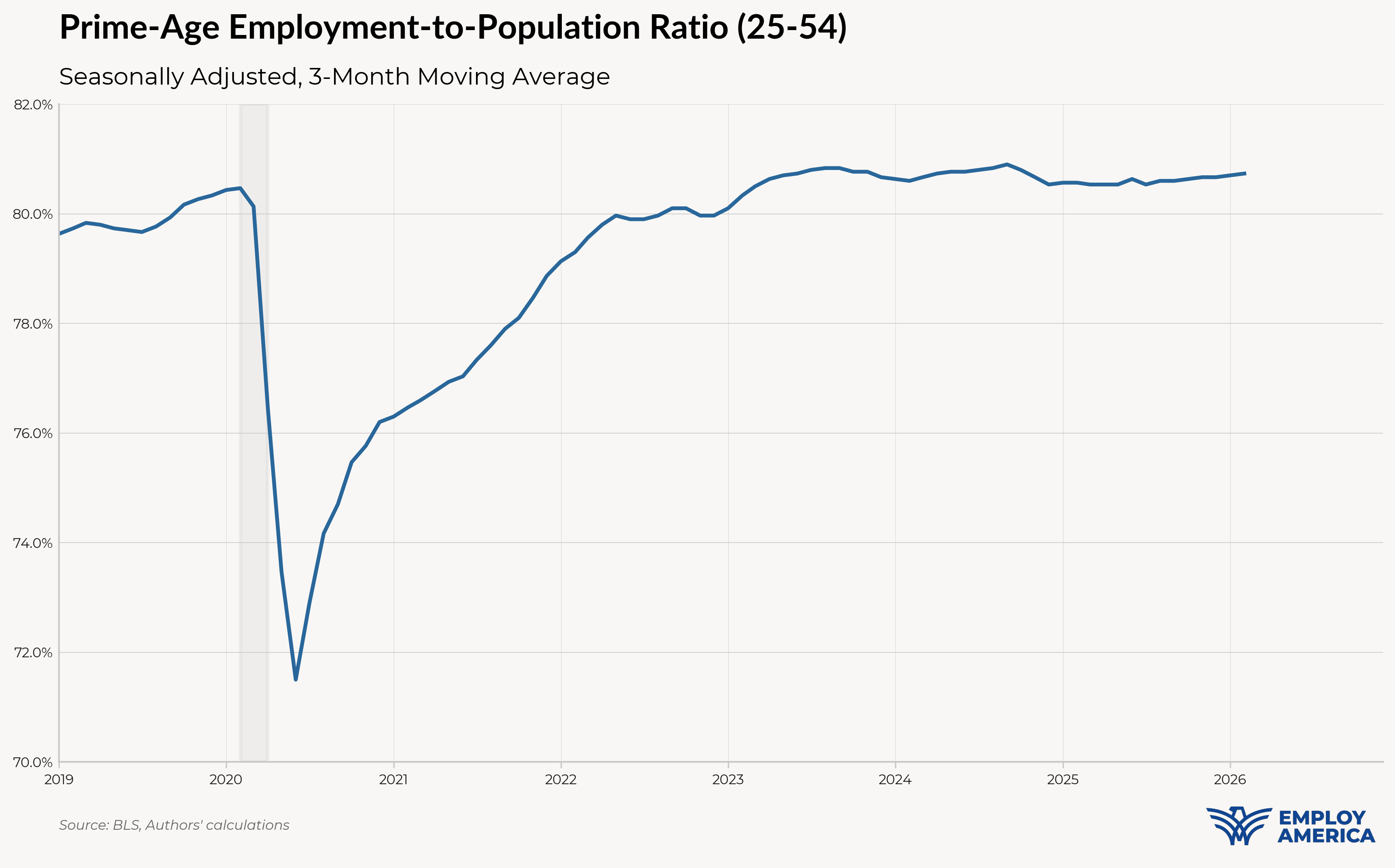 While this isn’t easy to read on the fly, a simple but powerful proxy for looking at the release of job day data is the Prime-Age (25-54) Employment to Population ratio.