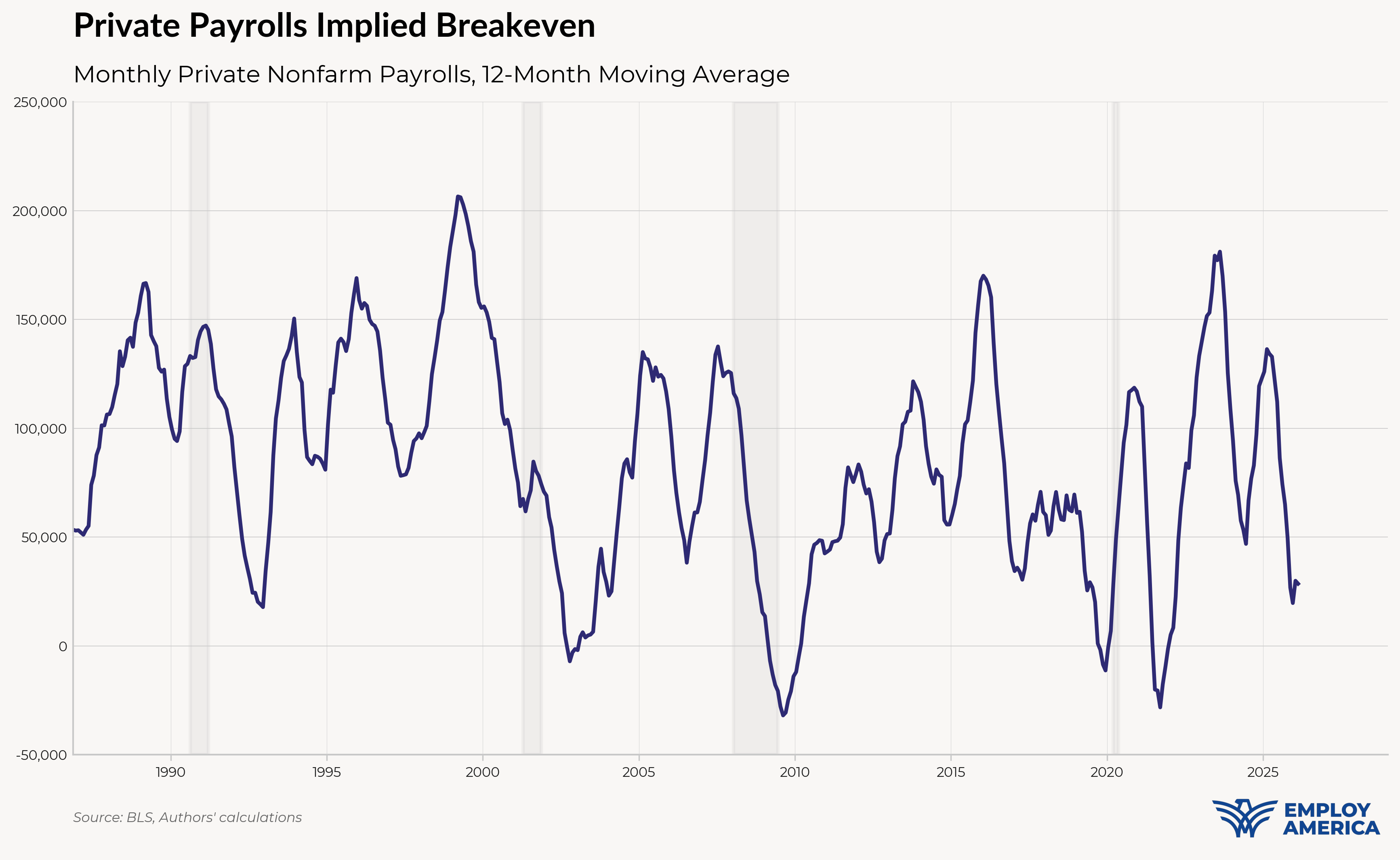 Unexpectedly low wage growth and a relatively stagnant employment rate mean that wage growth has slowed. Below, we take the difference between wage growth and observed changes in the employment rate (after adjusting for differences in family formation and research definitions) to support the break-even rate (for the ratio of employment to population). We currently estimate that NFP’s 40-50k private placements represent more than monthly earnings. This is still a work in progress, and we’ll have more details on our breakeven formula in the next post.